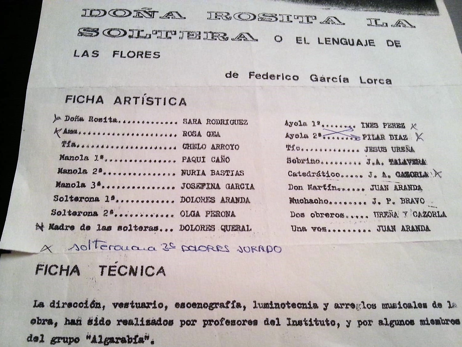 Ficha técnica del montaje de Doña Rosita la soltera, de Federico García Lorca a cargo del grupo de teatro Jacarandina