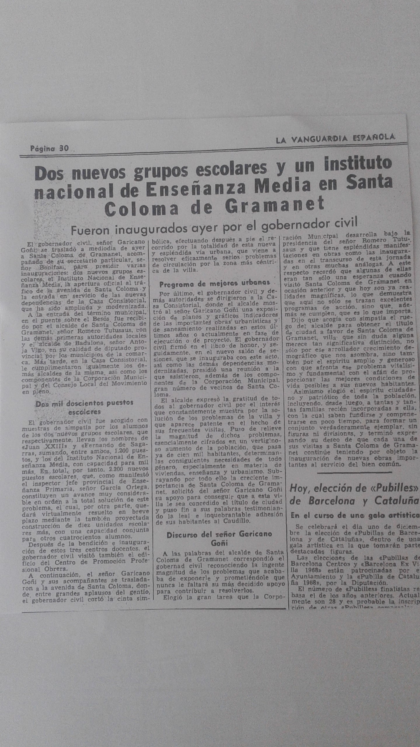 Notícia a La Vanguardia del 1-12-1968 sobre la inauguració oficial de l'Institut Puig Castellar